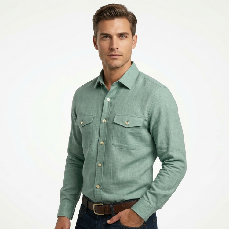Long-Sleeved Men's Linen/Cotton Two-Pocket Shirt with Color Variety!